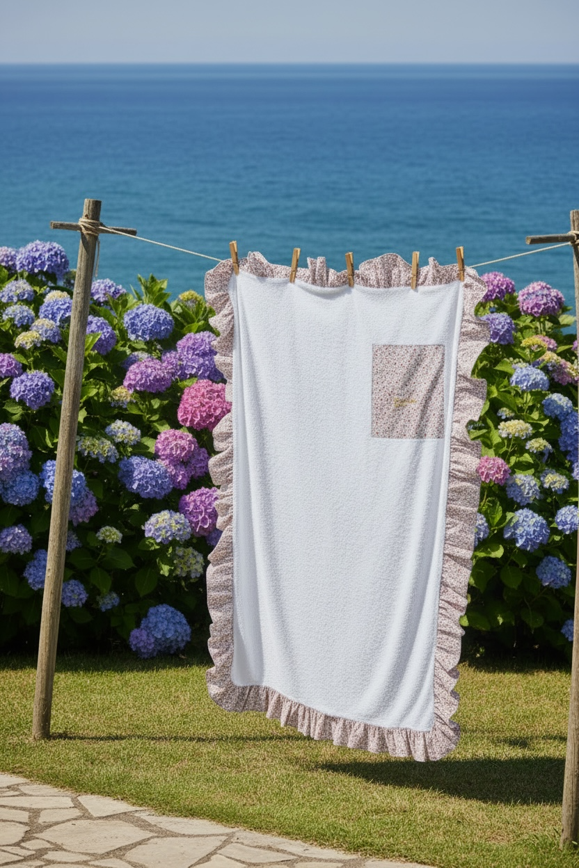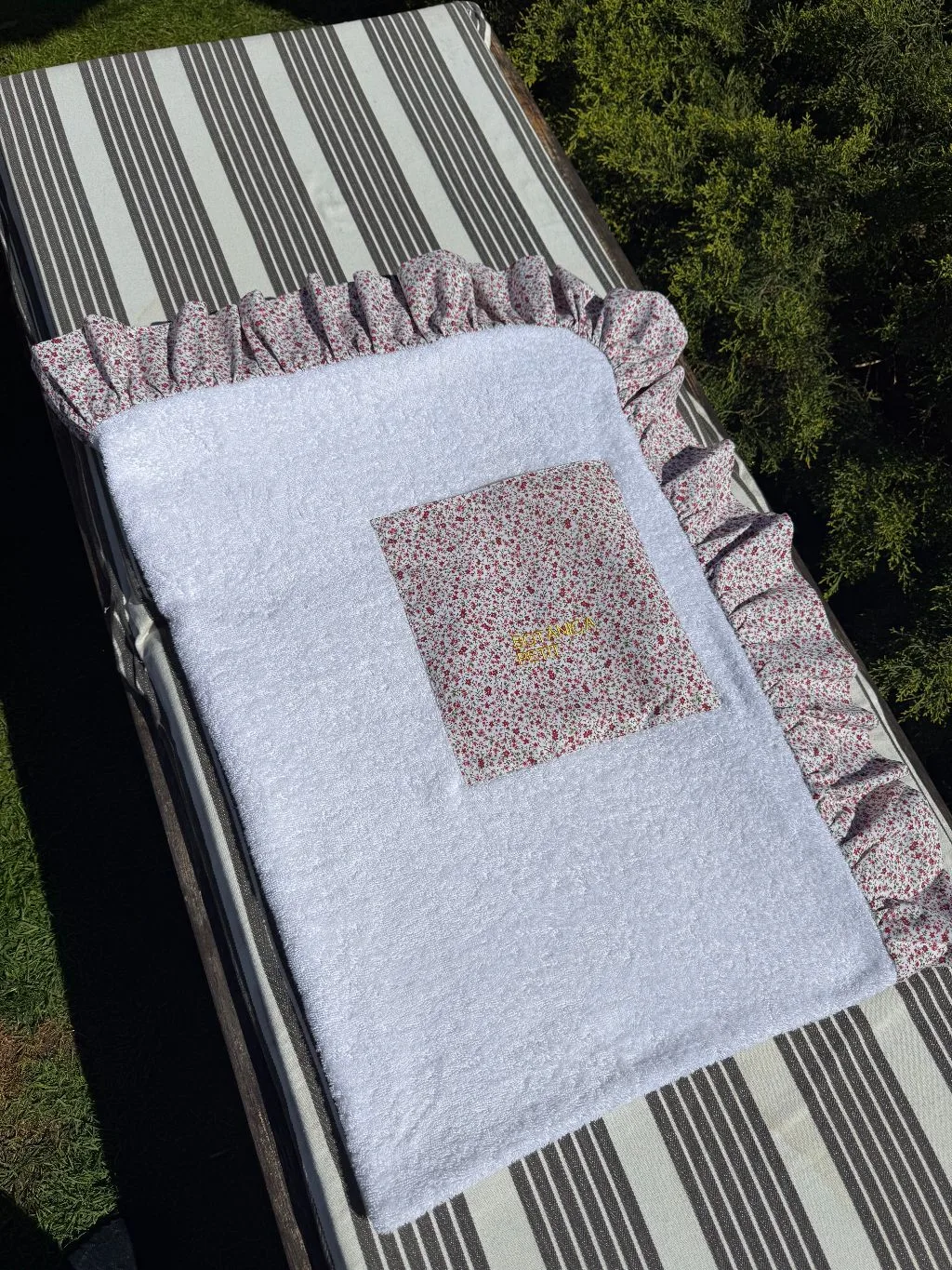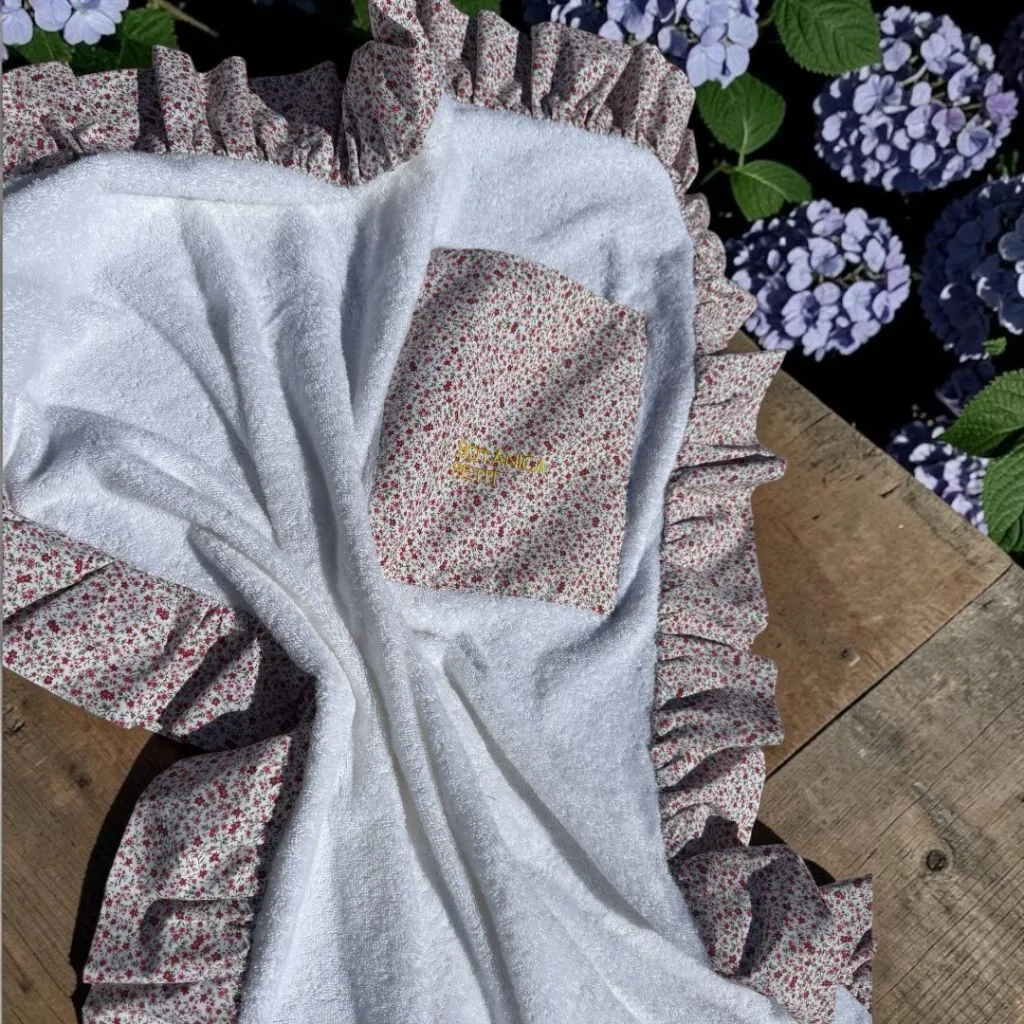 base en toalla blanca y bolsillo y volante en flores.