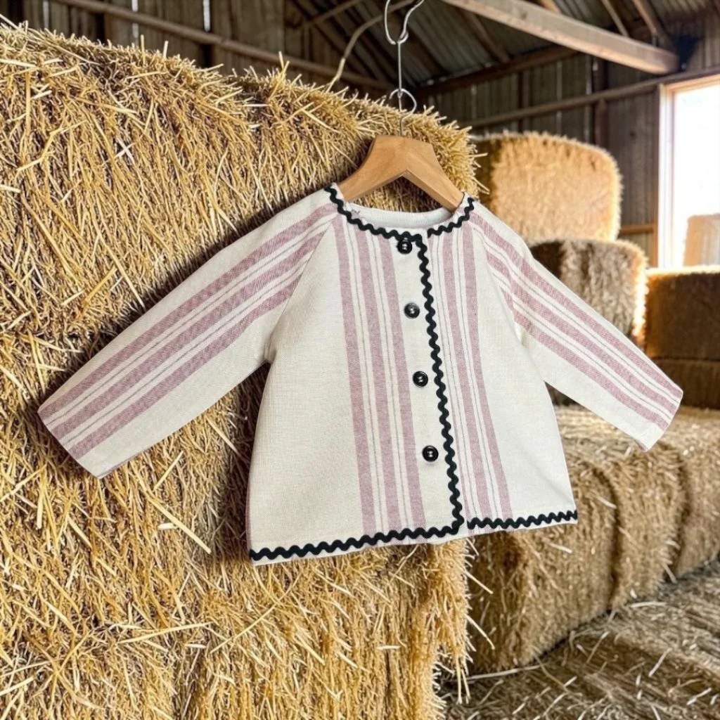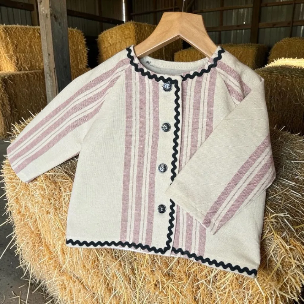 chaqueta ligera de manga larga, botonadura delantera, ondulina negra que recorre cuello, frontal y todo el bajo. es perfecta para llevar sola o con blusa por debajo, pueden llevarla abierta o cerrada
