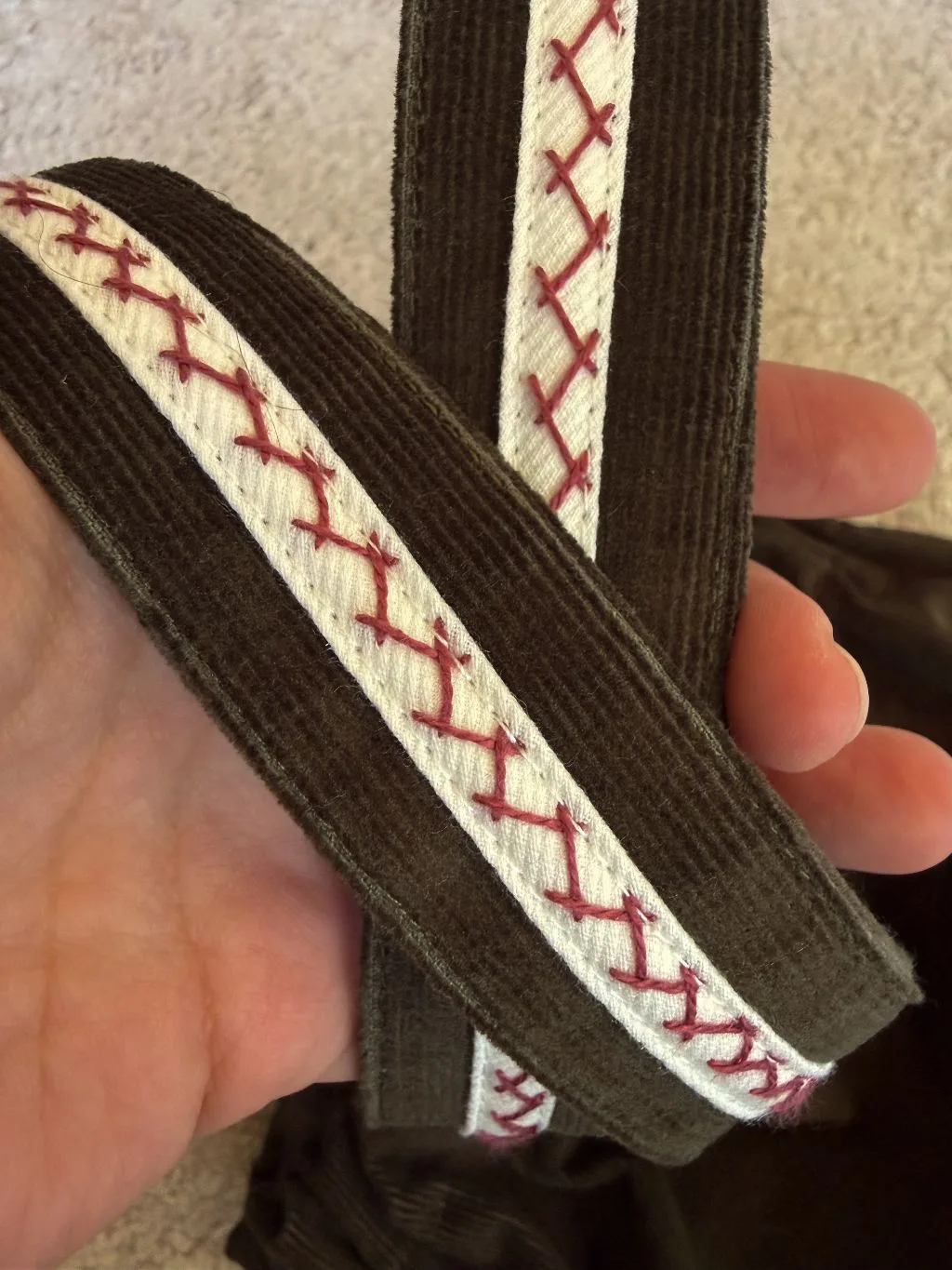 botones de madera cosidos con el mismo burdeos del bordado.