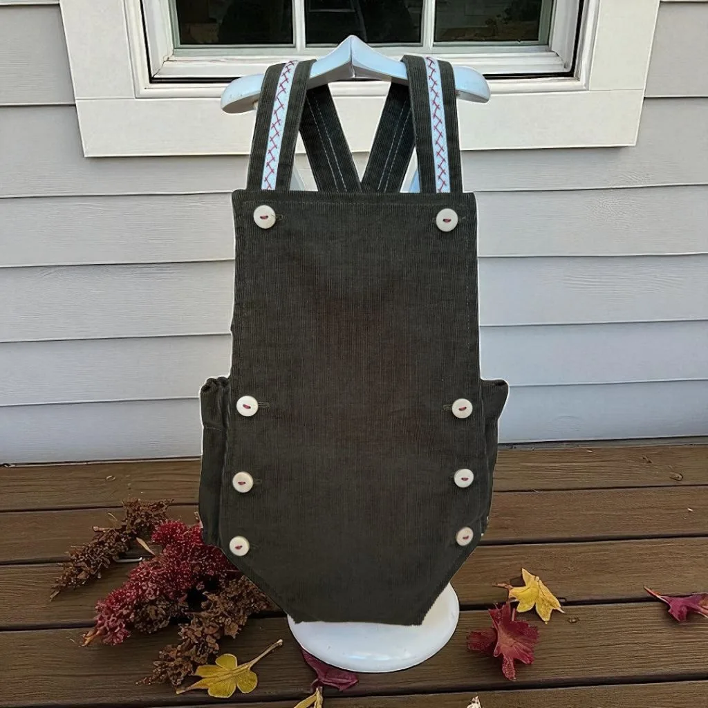 pelele que queda por encima del pecho, de tiras cruzadas en la espalda, estos tirantes llevan bordado hecho a mano también en color burdeos sobre una tira blanca.