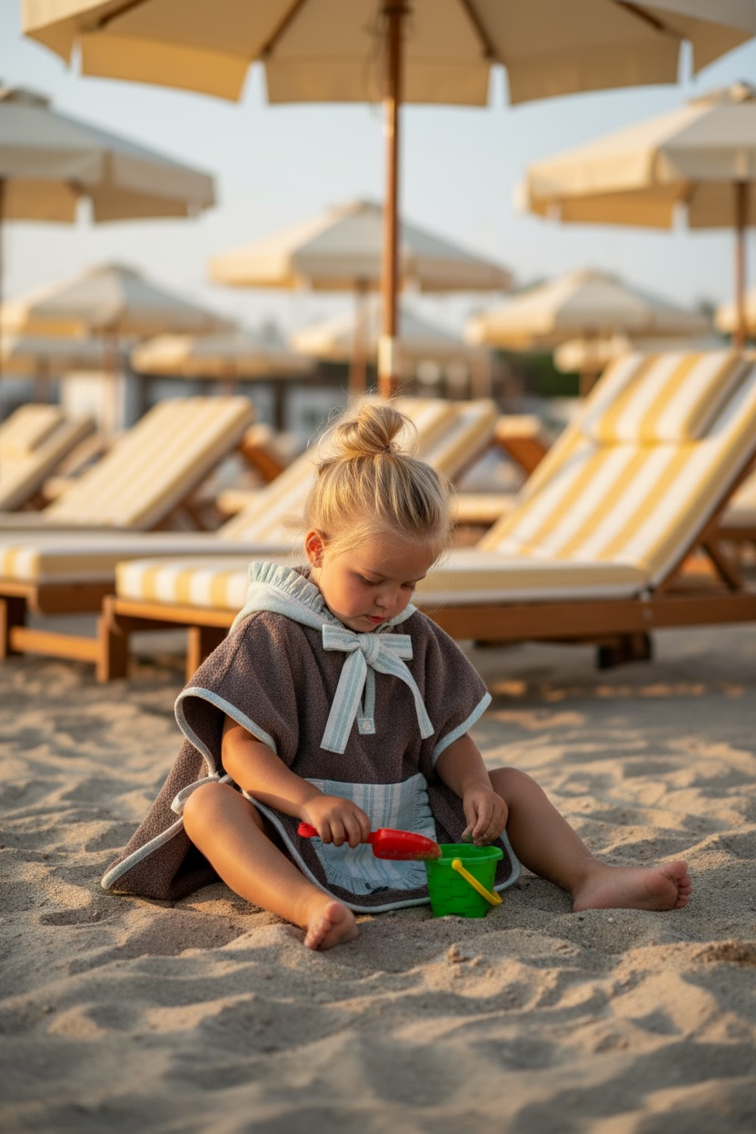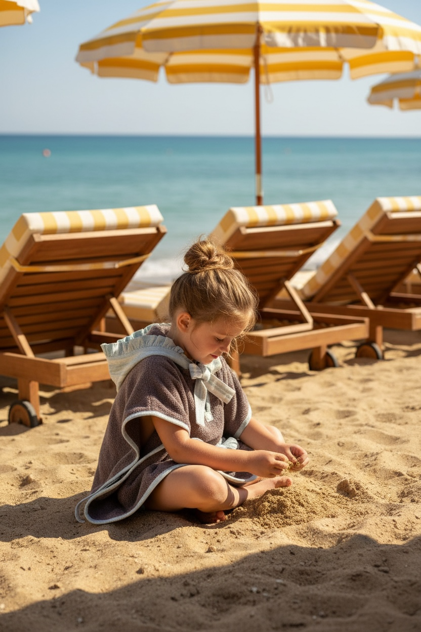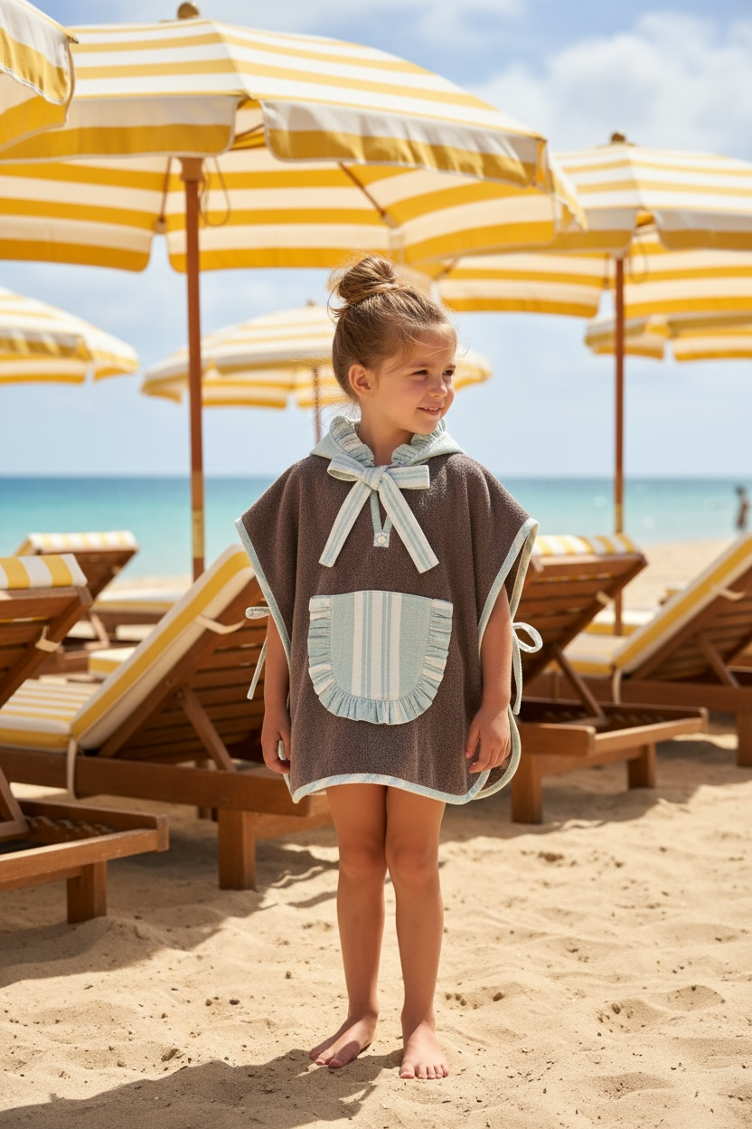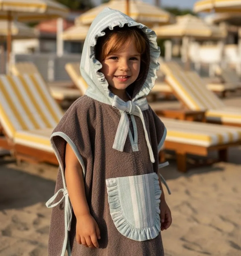 Poncho en toalla marrón claro, con una tela de rayas color natural sobre un fondo verde claro.